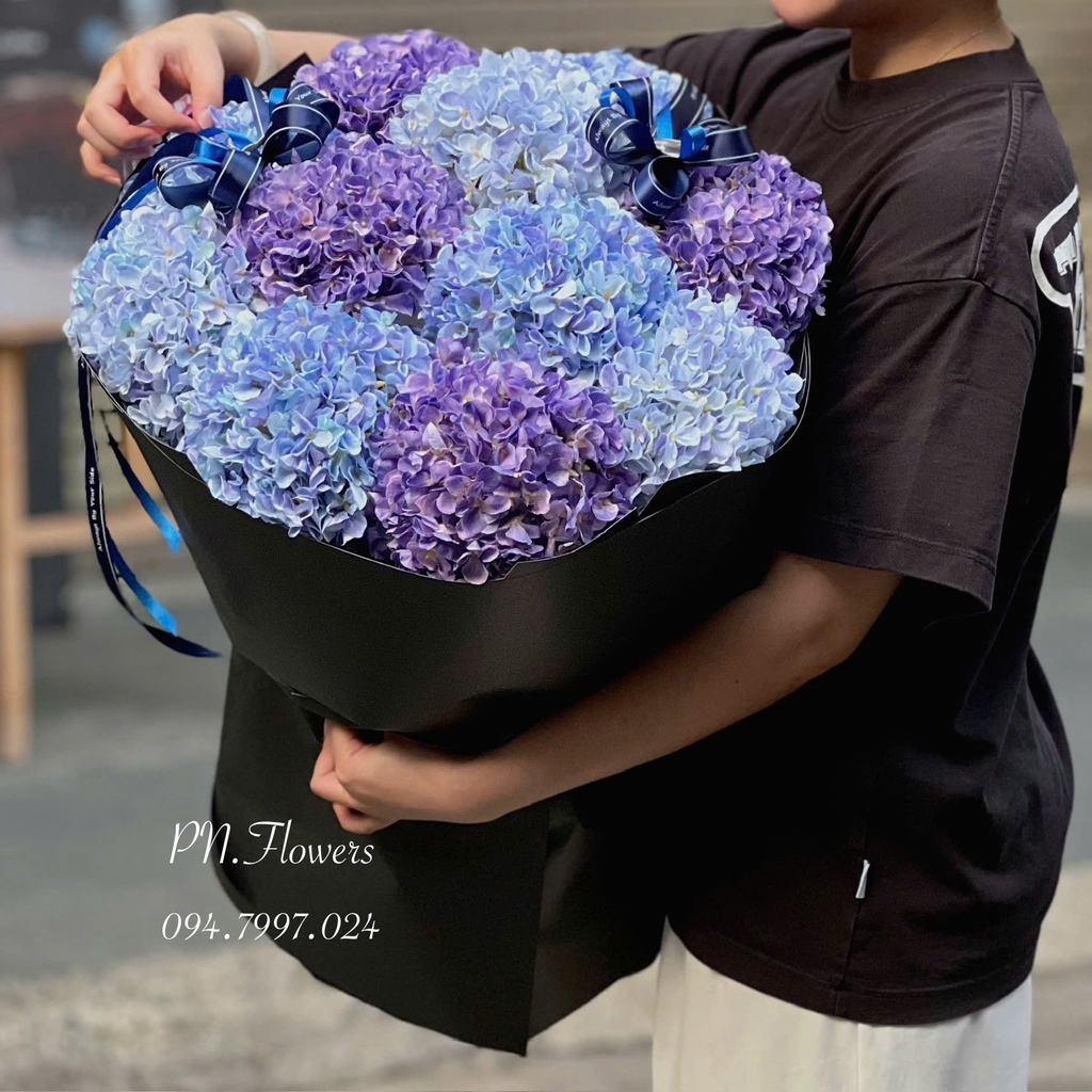 Bó hoa cẩm tú cầu tone xanh dương gồm: 11 bông cẩm tú cầu lụa.