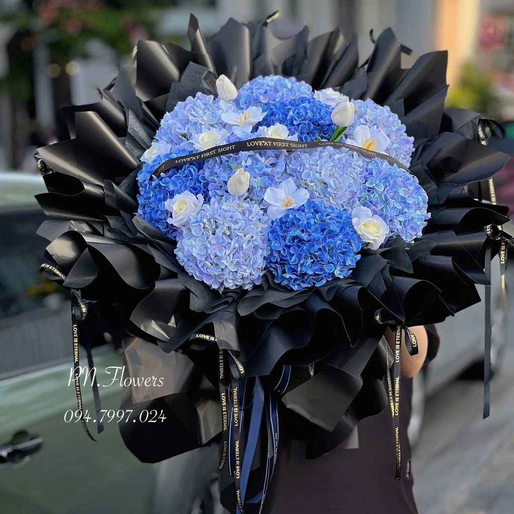 Bó Hoa Cẩm Cầu Lụa gồm: 10 bông cẩm tú cầu, mix hoa sáp hồng manta và tulip cao su.