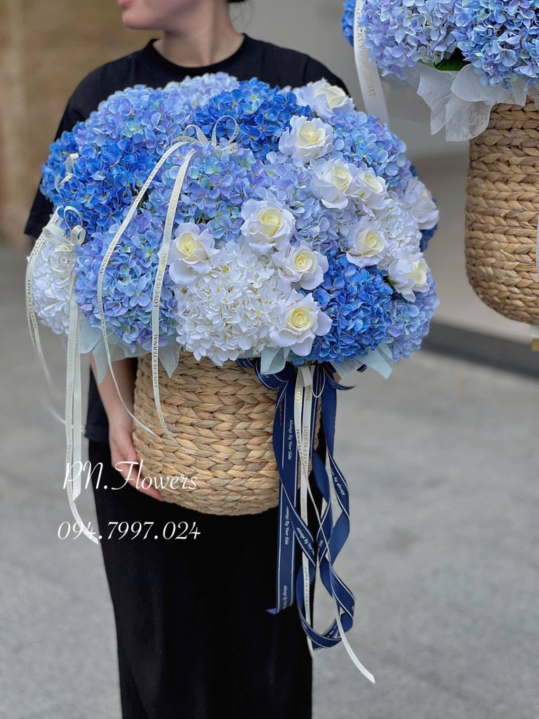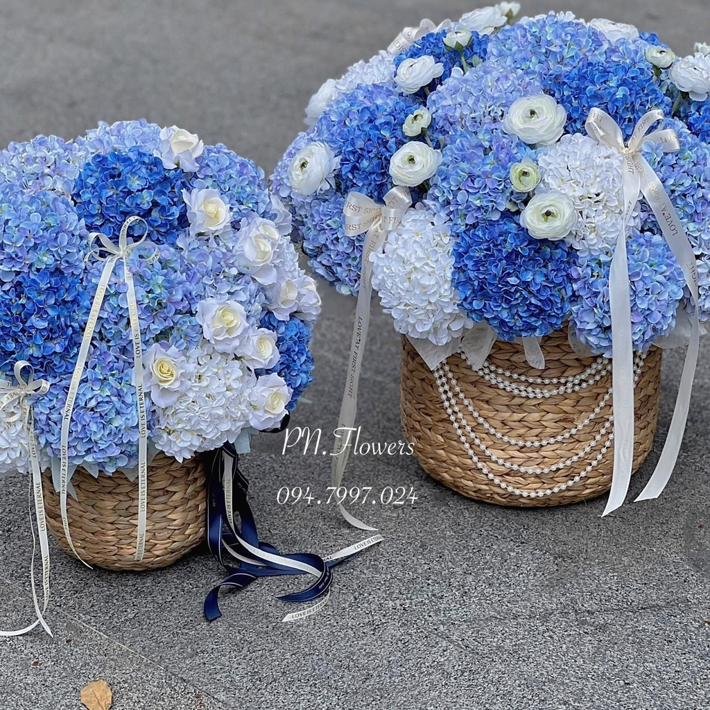 Giỏ Hoa Cẩm Tú Cầu Lụa 16 Bông Mix Tone Xanh Gồm: