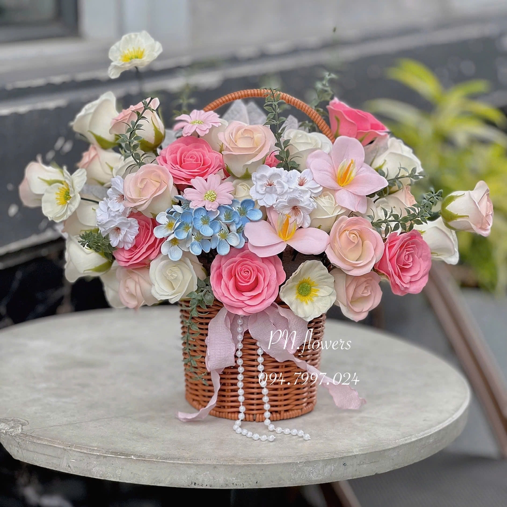 Giỏ mây cao cấp, hoa sáp thơm các loại: hoa hồng, tú cầu, cúc chibi, mai anh đào, ecuador, tulip, anh túc (Tất cả đều bằng hoa sáp).