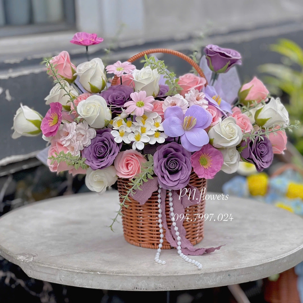 Giỏ mây cao cấp, hoa sáp thơm các loại: hoa hồng, tú cầu, cúc chibi, mai anh đào, ecuador, tulip, anh túc (Tất cả đều bằng hoa sáp).