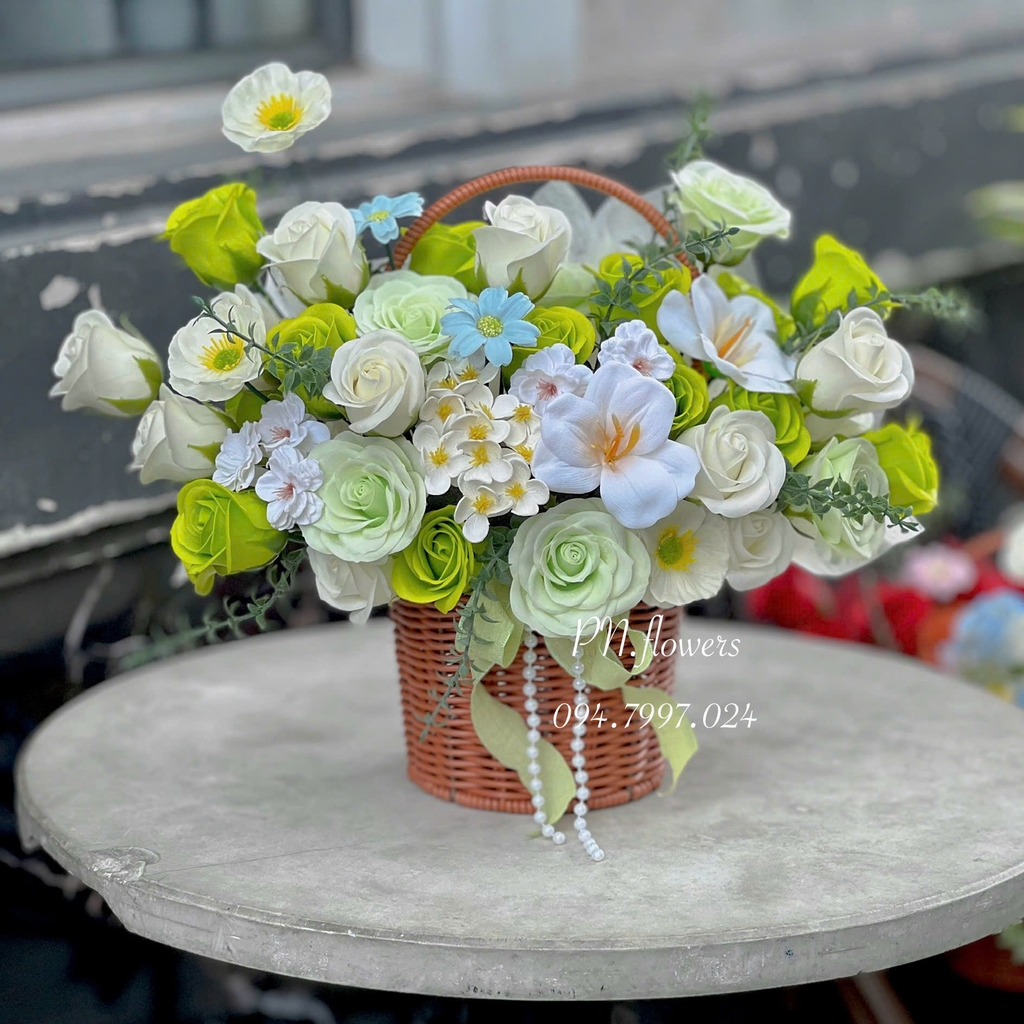 Giỏ Hoa Sáp Thơm 50 Bông Mix Tone Xanh Lá