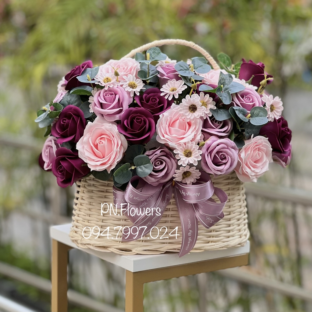 Giỏ Hoa Sáp Thơm 50 Bông Mix Tone Xanh Lá