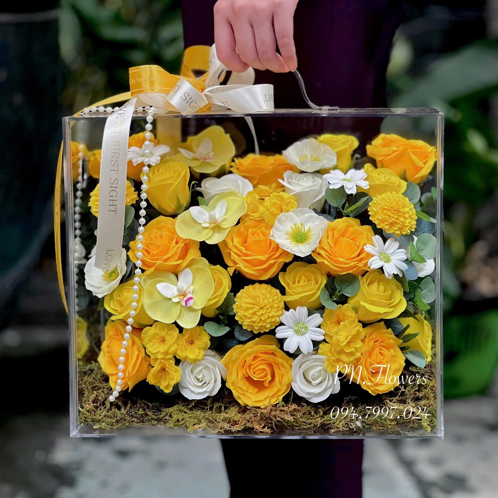 Thiết kế hộp mica cứng trong suốt, kết hợp hoa sáp thơm cao cấp. Mua ngay tại PN.Flowers để gửi gắm yêu thương!