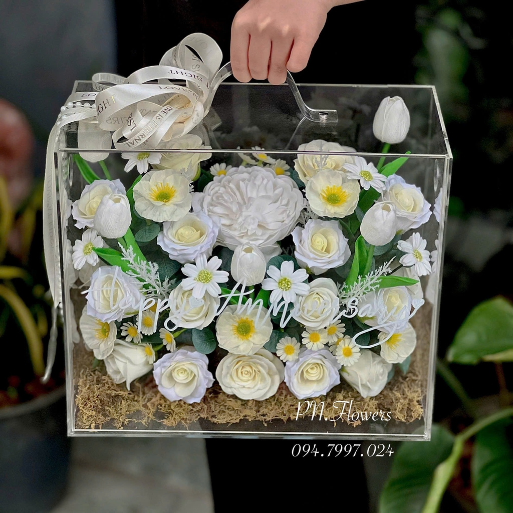 Thiết kế hộp mica trong suốt đẳng cấp, kết hợp hoa sáp thơm. Giao nhanh 1 giờ tại TP.HCM.