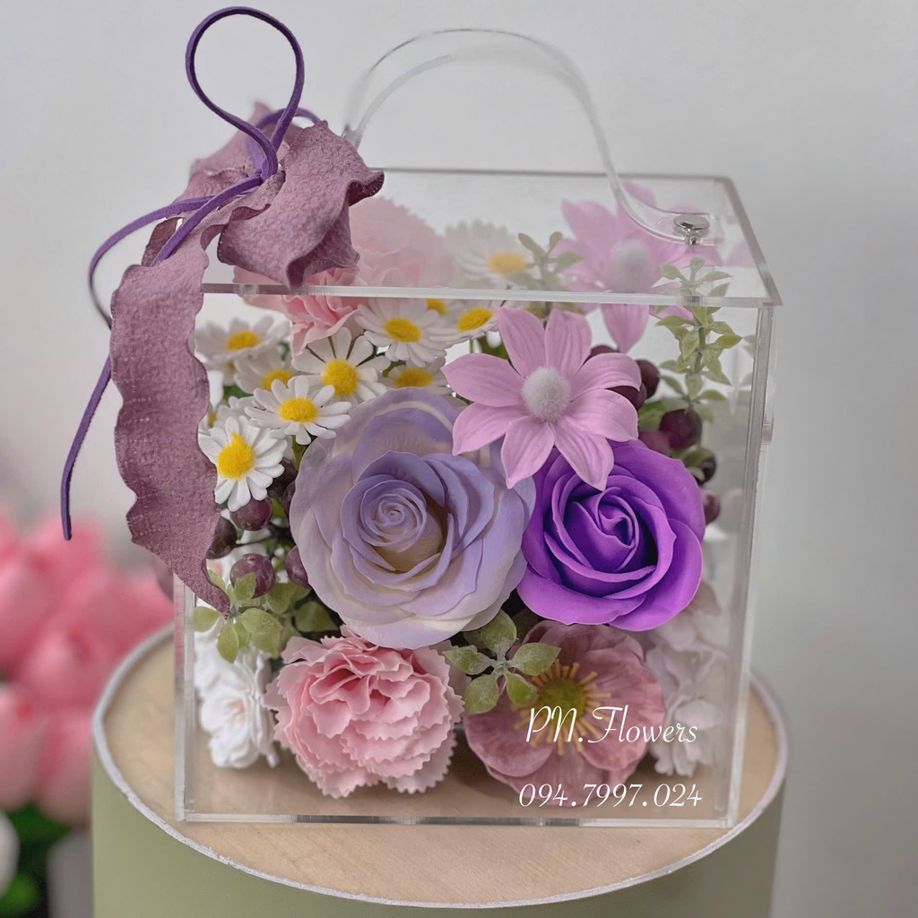 Thiết kế hộp mica cứng trong suốt, kết hợp hoa sáp thơm cao cấp. Giao nhanh 1 giờ tại TP.HCM.