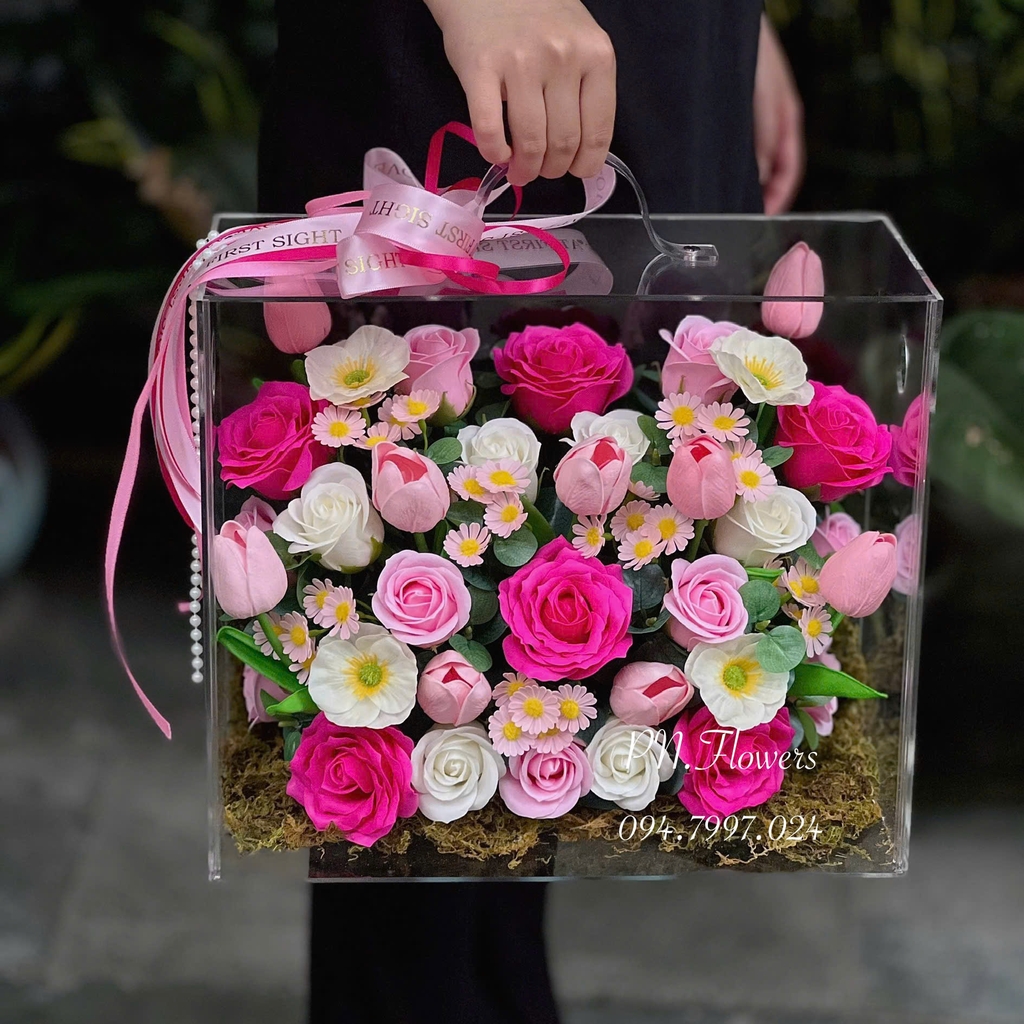 Thiết kế hộp mica trong suốt đẳng cấp, kết hợp hoa sáp thơm. Giao nhanh 1 giờ tại TP.HCM.