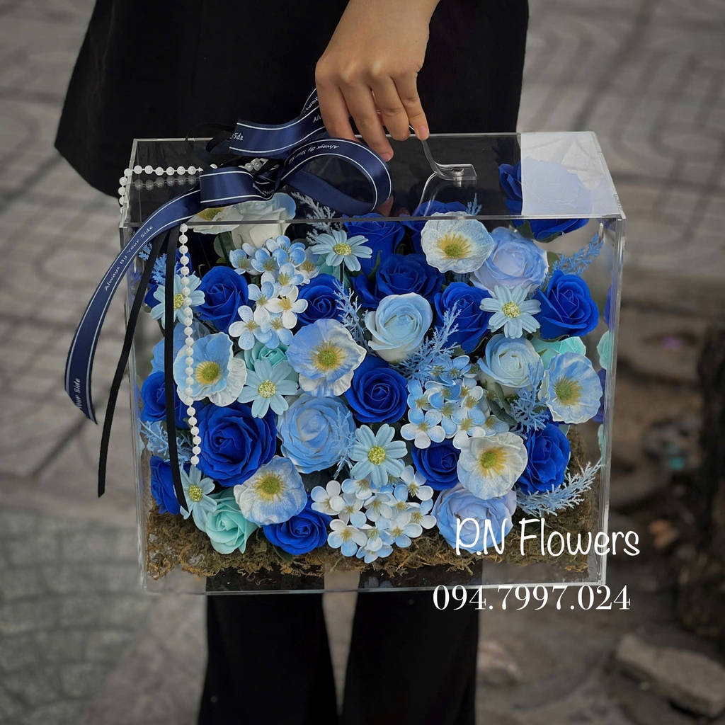 Thiết kế hộp mica trong suốt đẳng cấp, kết hợp hoa sáp thơm. Giao nhanh 1 giờ tại TP.HCM.
